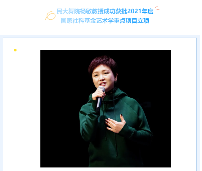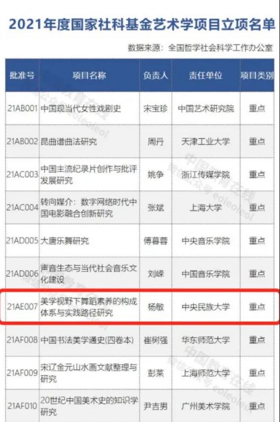 杨敏教授担任主持人申报的《美学视野下舞蹈素养的构成体系与实践路径研究》(项目号21AE007),经专家评审、社会公示,并报全国艺术科学规划领导小组批准,项目获得2021年度国家社科基金艺术学重点项目立项。