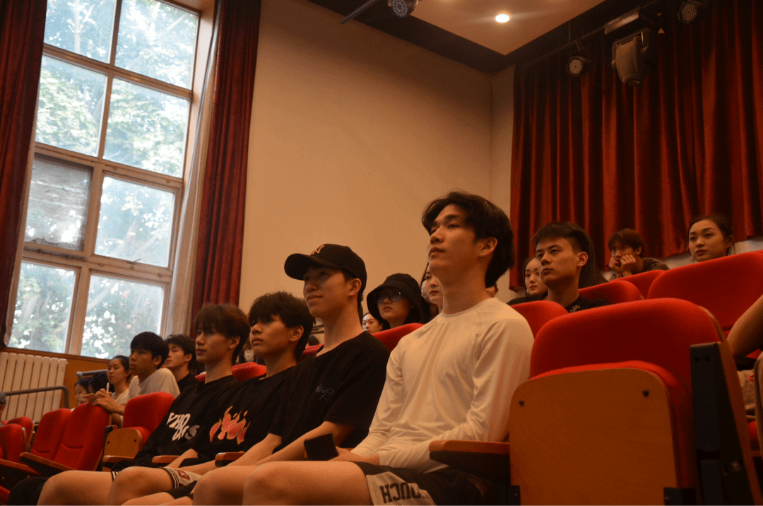 讲座主要是以实践形式来进行。在主讲人高旭澎的邀请下,现场的同学们纷纷积极上台参与互动,感受将“雁形”训练法与现代舞相结合的身体运动方式。首先,由高旭澎引导着场上的同学进行小空间的热身活动,让大家通过呼吸强化自己的身体感受,大胆的释放声音、解放身体,觉知自身的每个身体部位。