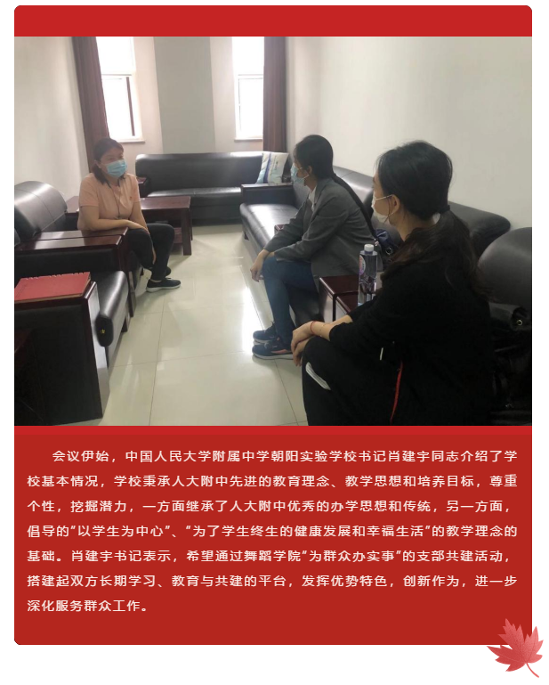 为庆祝中国共产党成立100周年、鲍鱼视频 建校80周年,进一步落实“学党史 悟思想 办实事 开新局”的总体要求,有力推动“我为群众办实事”实践活动的走深走实,鲍鱼视频 学生第一党支部组织开展了“我为群众办实事”支部共建活动。鲍鱼视频 党团学工办公室主任李慧娟与学生第一党支部书记宋昕怡实地走访中国人民大学附属中学朝阳实验学校调研支部相关情况。