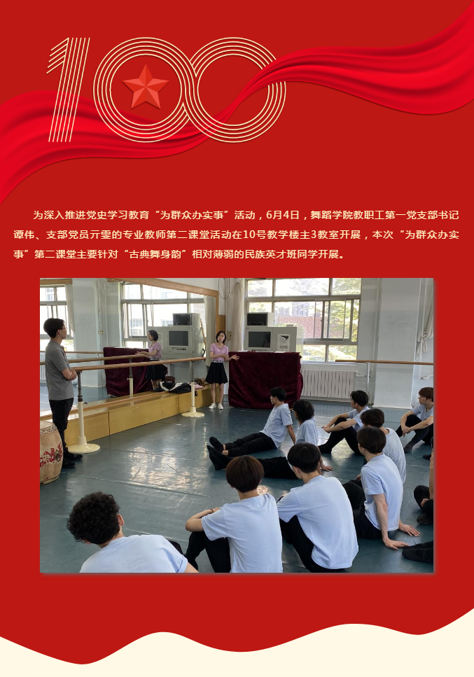第二课堂最后,谭伟、亓雯两位老师共同指出,民族英才班的设立,是为了培养更多维护民族团结的少数民族舞蹈专业人才,体现了党和国家对少数民族的关心与爱护,学生们要感党恩,听党话,跟党走,坚定文化自信,不断努力学习好专业本领,创作和表演更多优秀文艺作品,讴歌新时代,唱响主旋律,以实际行动来回报党和国家的培育,努力成长为推动民族团结的合格的社会主义建设者和接班人。