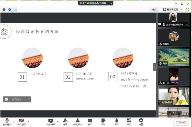 关心下一代工作委员会副主任蒙小燕教授为2022级全体新生讲授“在党的阳光照耀下茁壮成长——漫谈民族舞蹈教育发展”。学院党委书记、关心下一代工作委员会主任马娟、关心下一代工作委员会秘书长李慧娟参加会议,会议由马娟书记主持。
