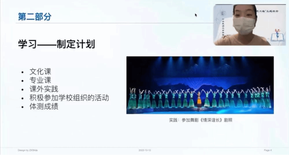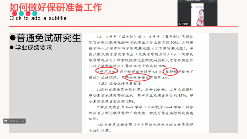 孙婷婷老师为同学们进行本科学习教育。首先,她强调期末考试中设备调试、诚信考试、以及专业考试场地安全等注意事项。接着,她向同学们详细讲解民大舞院保研的类型、名额、资格要求、学业成绩要求等方面的信息。同时她向同学们分享考研的准备工作,并表示希望同学们能够提前规划好学习和生活实践。