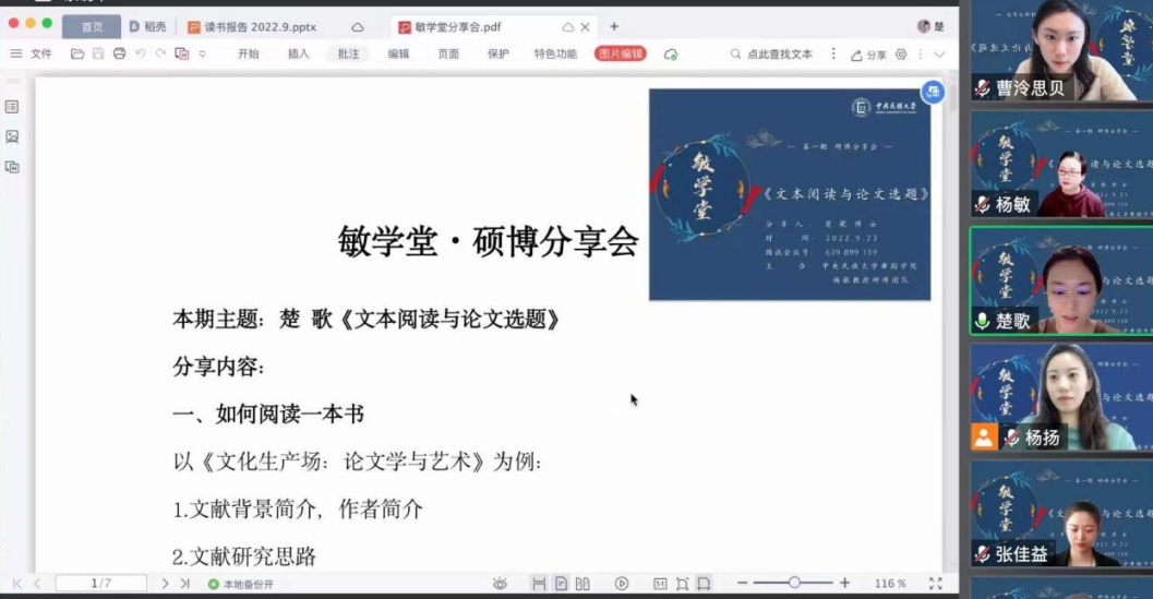 2019级博士研究生楚歌主讲,主题为《文本阅读与论文选题》,此次硕博分享会鲍鱼视频