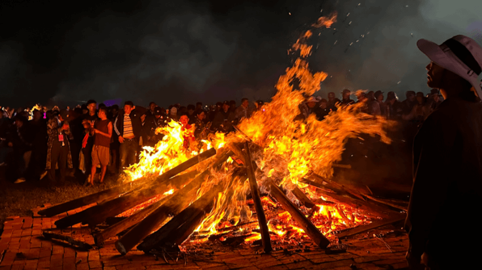 夜晚,随着远山的星火传向会场,火把节迎来狂欢高潮。一个个火堆被依次点燃,人们竞相奔走、点燃火把,驱逐邪祟,祈祷吉祥。此时的谷克德,已成为了火的海洋。调研团与当地各族人民一起围着熊熊篝火堆,跳起达体舞,在云端湿地尽情高歌,领略彝族文化风情。