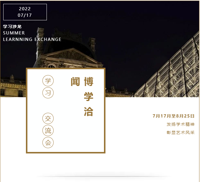 研究生会学术部特联合团委宣传部举办了“博学洽闻”交流会之暑期学习沙龙,旨在为同学们提供良好的居家自习空间,利用假期时间提高自身知识技能,发扬学术精神,彰显艺术风采。