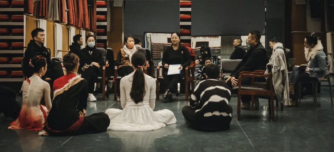 在编导们阐述作品立意、结构和创新点后,舞者们逐一表演作品,最后在马云霞院长的引导下,各位编导、演员相互交流意见。从内容层面的作品结构、动作设计、演员表演细节到形式层面的服装、音乐、道具及妆容等各个方面进行讨论,大家纷纷献计献策,碰撞出许多创意的火花。