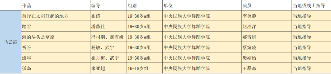 此次入围的舞者有李美静、赵浩洋、郝雪妍、蔡宛凌、樊婧怡、王磊森,表演的作品分别是由崔涛编创的《前行在太阳升起的地方》,潘薇佳编创的《踏雪》,冯司期、郝雪妍编创的《海的尽头是草原》,杨敏、武宁编创的《祈盼》,崔月梅、武宁编创的《流年》,朱亚超编创的《孤岛》。
