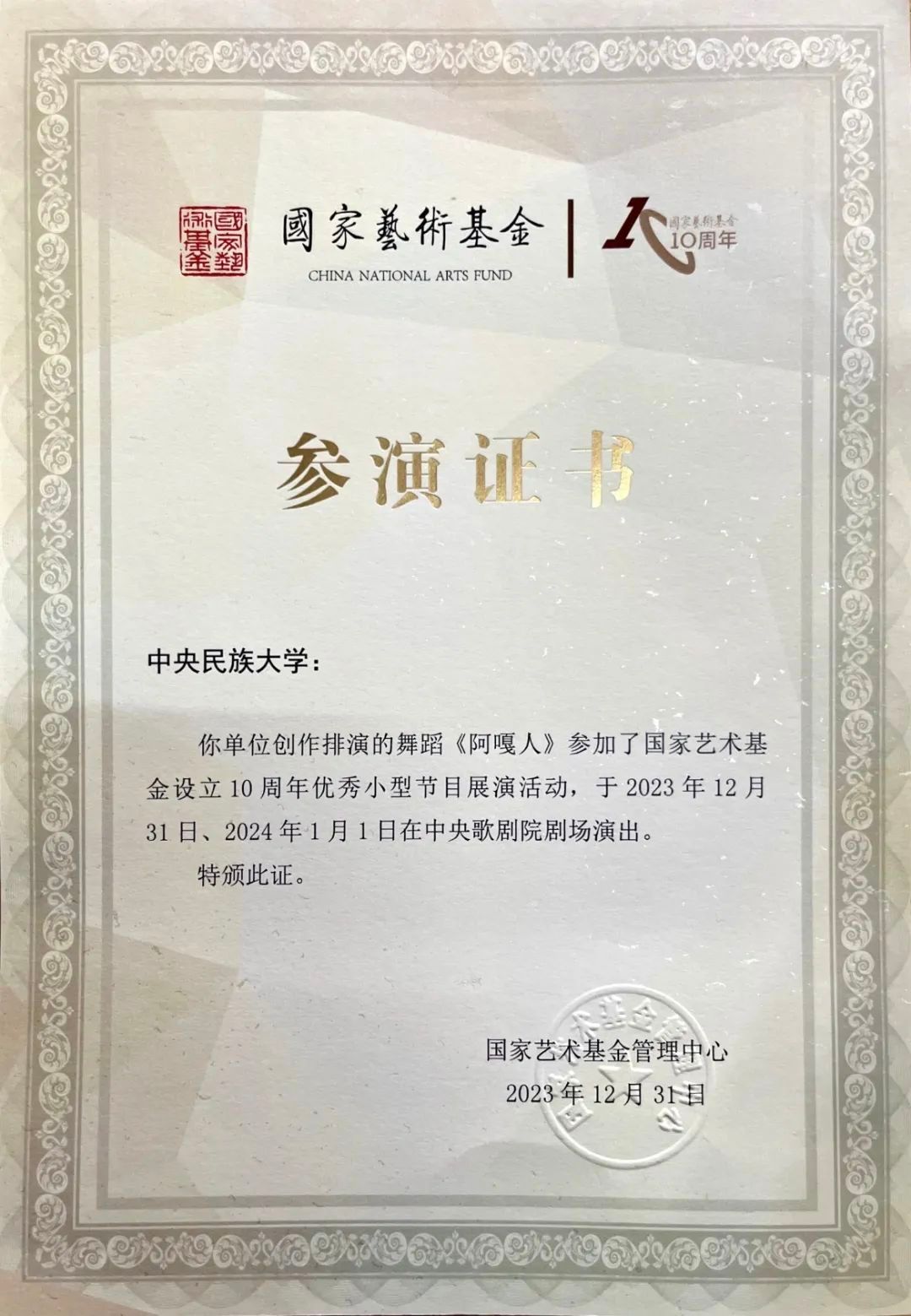 创演的藏族男女群舞《阿嘎人》受邀参加“为人民绽放”——国家艺术基金设立10周年优秀小型节目展演活动,并于中央歌剧院剧场举办。文化和旅游部、中国文学艺术界联合会、国家艺术基金理事会领导出席活动。同时演出内容在文化和旅游部政府门户网站、新华网、抖音、爱奇艺等网络媒体上播出,为广大人民群众奉献一场充满精神力量的文艺盛宴。