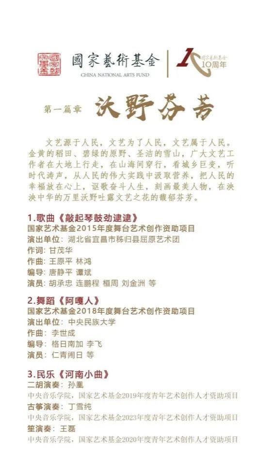 国家艺术基金2013年设立以来,始终坚持以习近平新时代中国特色社会主义思想为指导,学习贯彻习近平文化思想,推出了一批优秀作品,组织了一批品牌活动,培养了一批领军人才,为繁荣发展社会主义文艺事业作出了积极贡献,担负起了新时代赋予的使命任务。为进一步搭建平台,汇聚资源,让人民群众共享发展成果。国家艺术基金管理中心从获得国家艺术基金资助的舞台艺术创作项目和青年艺术创作人才项目中,精选了一批书写伟大时代、讴歌奋斗人生、刻画最美人物的歌曲、器乐、舞蹈、戏曲、木偶、皮影、杂技节目,组织了以“文艺的百花园永远为人民绽放”为主题的展演活动。