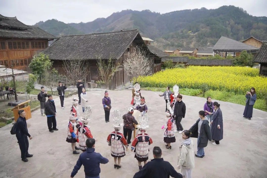 基地进行研讨及田野采风活动。团队秉承“扎根田野·虚心学习·美美与共”的宗旨,对苗族源远流长的历史文化、丰富多彩的非遗舞蹈、自然淳朴的民风民俗等多个方面进行考察,并在传习的过程中与传承人深入交流,进一步夯实后续学术研究与实践创作的基础。