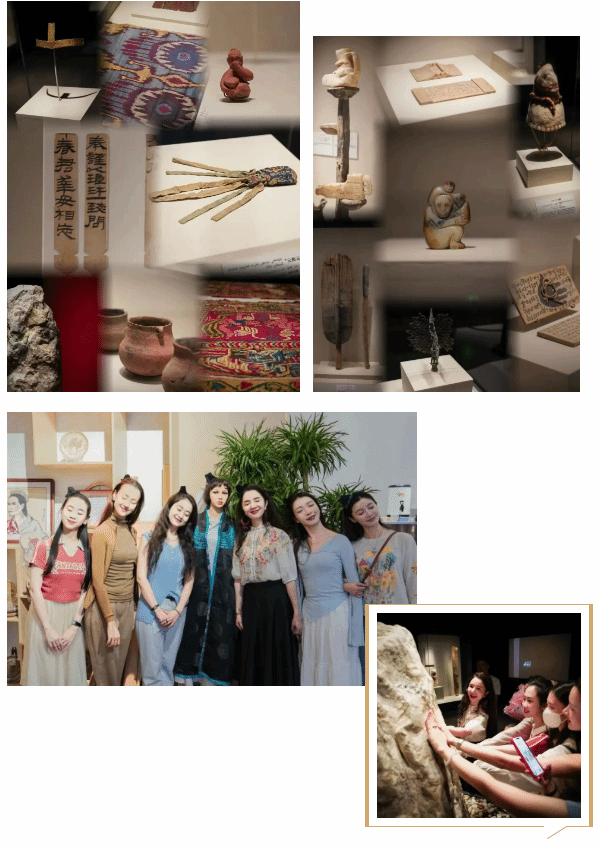 实践团首站来到了和田博物馆,通过对和田各时期和尼雅遗址出土历史文物、图像资料,以及舞蹈俑、古乐器实物及壁画临摹本的研读,从珍贵历史文物中直观追溯了新疆舞蹈艺术的历史源流与发展脉络,为理解当代非遗舞蹈的形态特征与文化内涵提供了深厚的历史依据。
